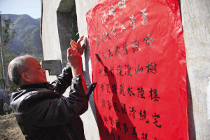 ▲55岁的彭春霖将修路事迹写成诗,贴于村内醒目位置,便于路人传颂。
