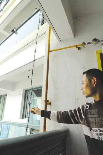 昨天上午,记者在黄龙康城5组团6幢看到,3单元厨房阳台与4单元客厅阳台距离约两尺,两阳台之间有一根煤气管道,管道旁有一根铁丝。抓住管道和铁丝,两脚蹬住3单元与4单元的墙体,即可轻松进入任何一家阳台。