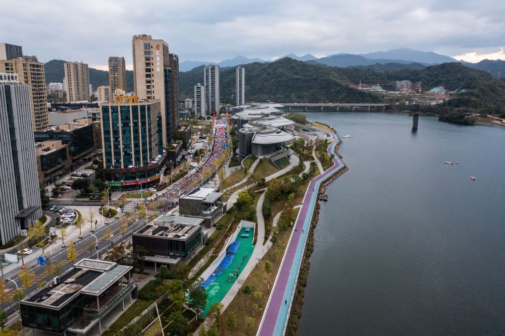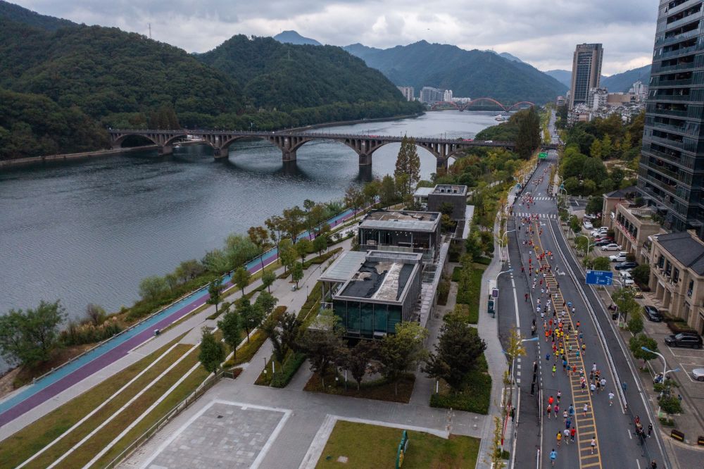 10月17日,参赛运动员奔跑在建德新安江畔的赛道上(无人机照片)。新华社记者 徐昱 摄