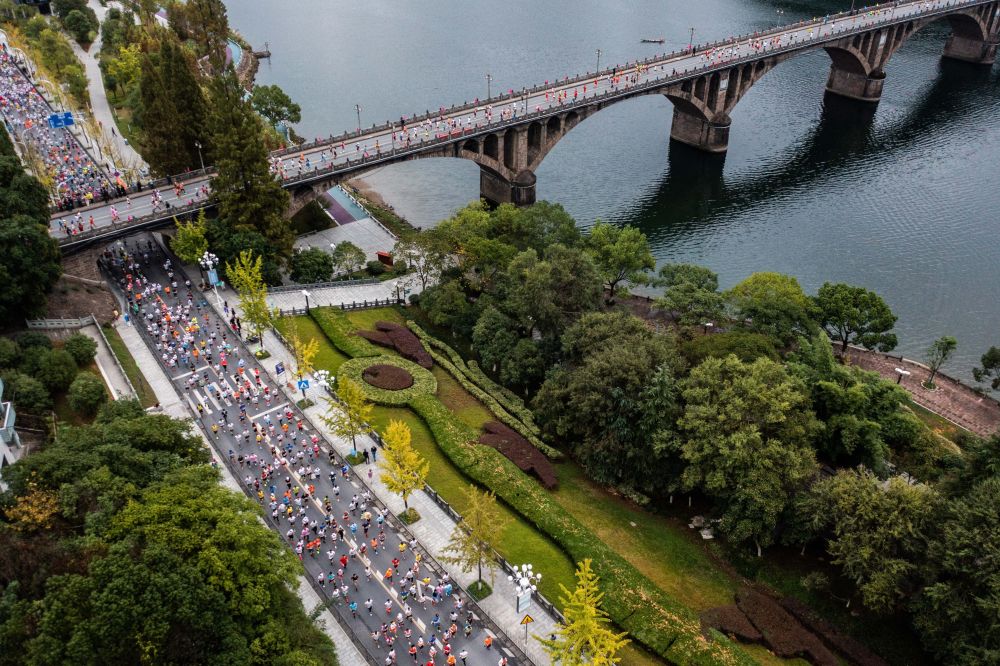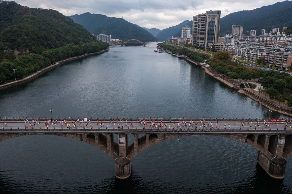 10月17日,参赛运动员奔跑在建德新安江的白沙大桥上(无人机照片)。新华社记者 徐昱 摄