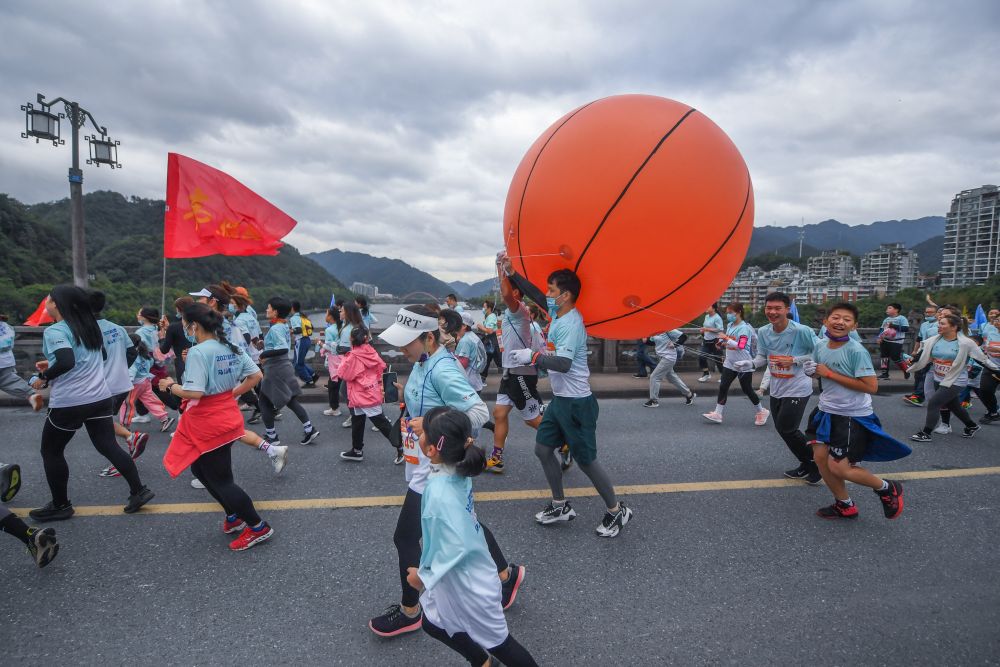 10月17日,参加欢乐跑的市民群众奔跑在建德新安江的白沙大桥上。