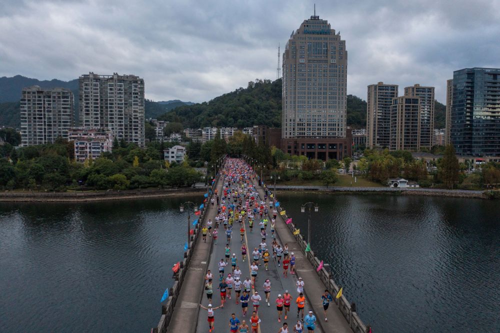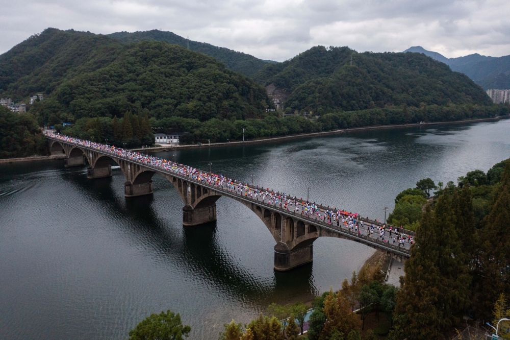 10月17日,参赛运动员奔跑在建德新安江的白沙大桥上。新华社记者 徐昱 摄