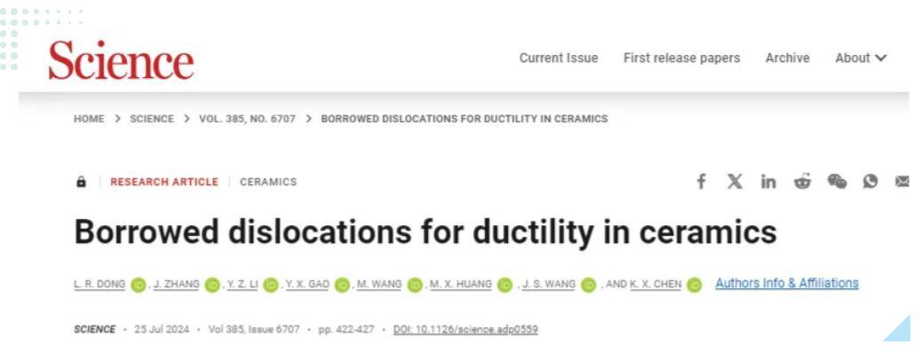 前不久,《科学》(Science)刊发一篇题为“Borrowed dislocations for ductility in ceramics(借位错机制实现陶瓷拉伸塑性变形)”的论文。科研人员通过一种向金属“借”位错的新机制,在室温条件下实现了陶瓷的拉伸塑性变形。据悉,这在世界上尚属首次。