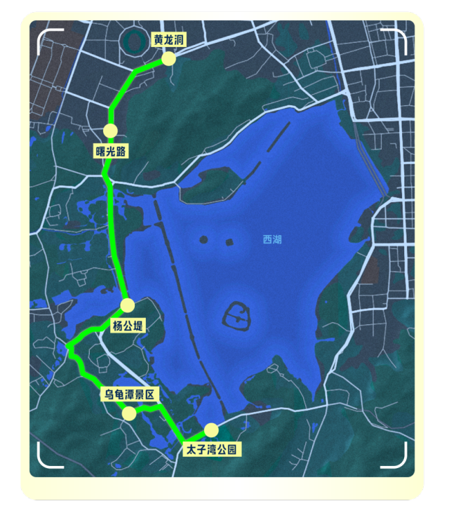 这条线路被骑行者们称为“百骑不倦”的经典路线。入夜的太子湾公园不及白天时人多,满园的绿意温柔地涌入眼帘,带走了骑行者的倦意;而本就清幽的乌龟潭,在夜幕降临时更为寂静,倾听蛙鸣虫唱,感受大自然给予的治愈;曙光路紧邻西湖,两侧林木郁葱,骑行沿途更有西湖新十景中的“宝石流霞”和“黄龙吐翠”等自然景观。