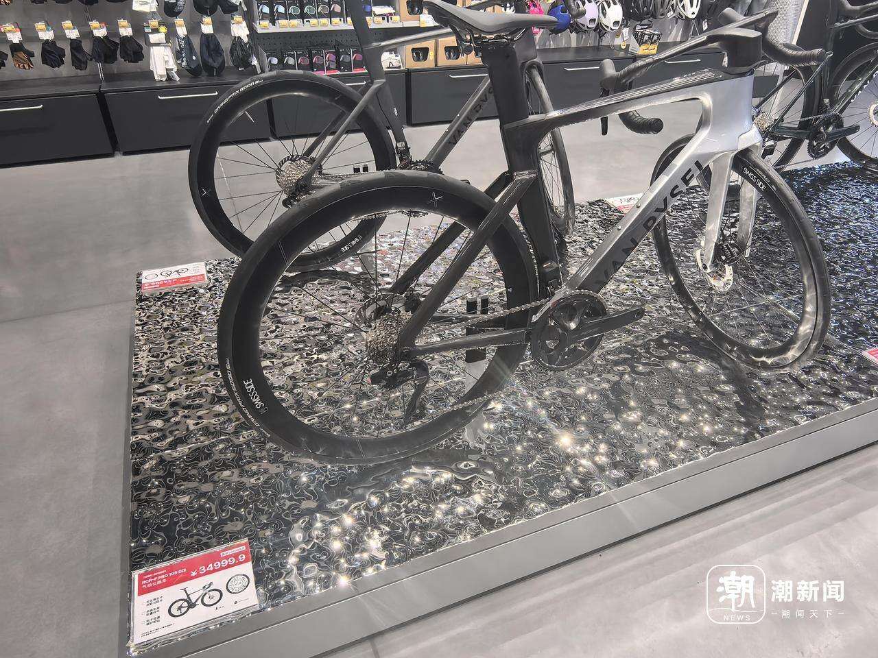 在滨江宝龙城的迪卡侬门店,4台迪卡侬旗下的高端公路自行车品牌VAN RYSE气动公路车摆放在展厅的显眼位置,价格牌上都挂出了促销优惠。其中一台价格牌显示原价46999元,优惠价39999元,另一台原价39999元,优惠价34999.9元。中低端车型的一款女士双刹公路自行车,价格也从2199元降为1999元。