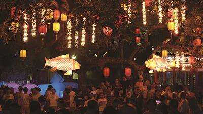 在树王打卡互动区里,街市中央的千年古树披挂诗词灯串,一旁的“月老办事处”“缘分桥”等点位吸引不少年轻人驻足互动。