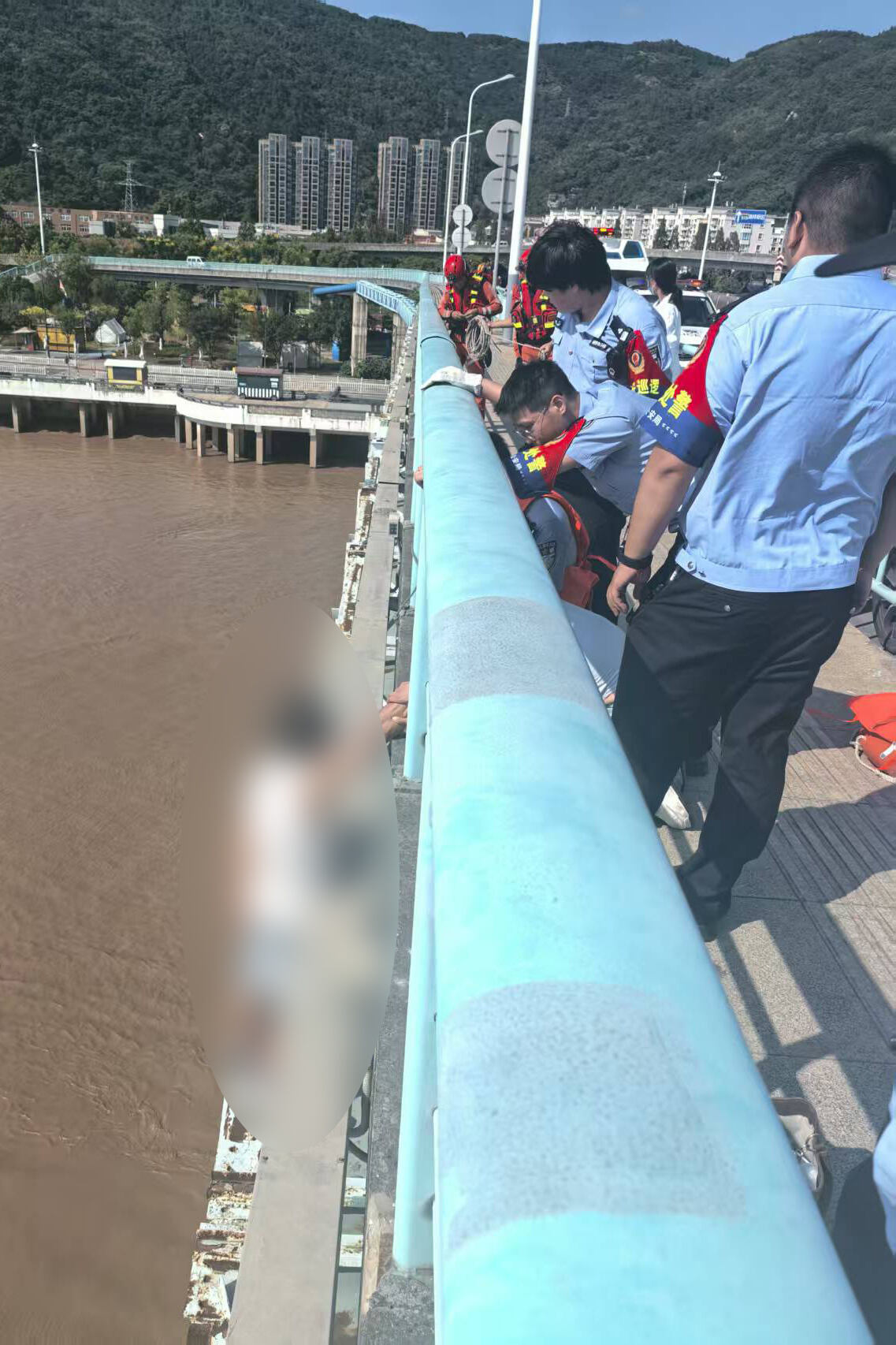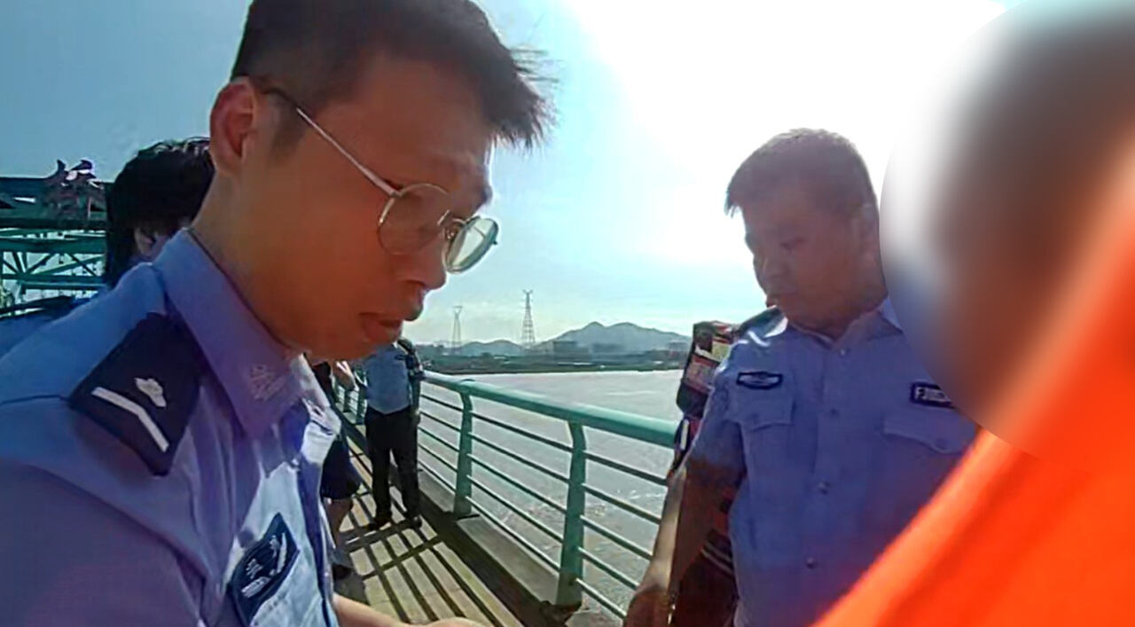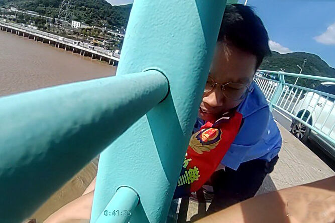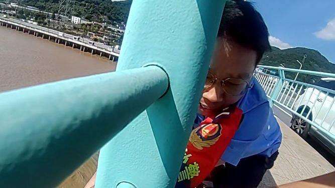 14时10分许,宋若伟等人赶到飞云江五桥,只见一名男子正在翻越桥边护栏,身体已经在桥外,稍有不慎便会坠落江中。
