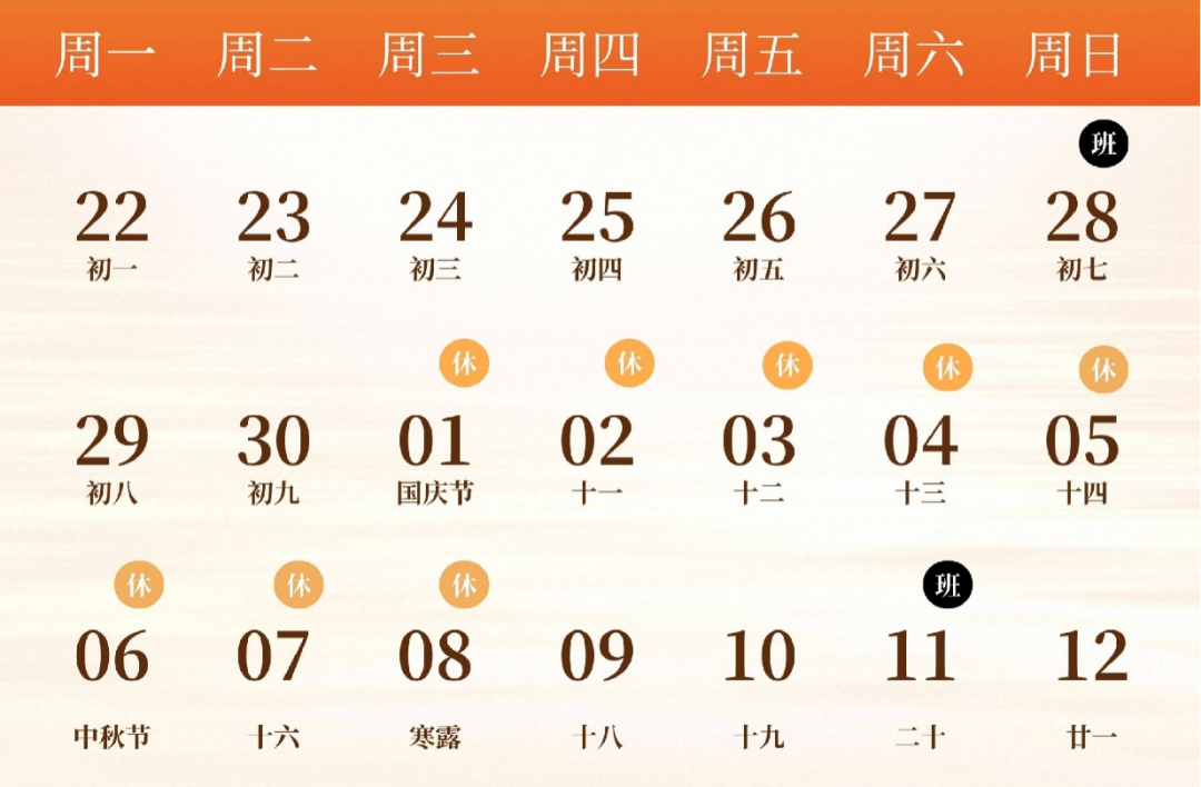 根据《国务院办公厅关于2025年部分节假日安排的通知》,10月1日至10月8日国庆节放假调休,共8天,9月28日(星期日)、10月11日(星期六)上班。