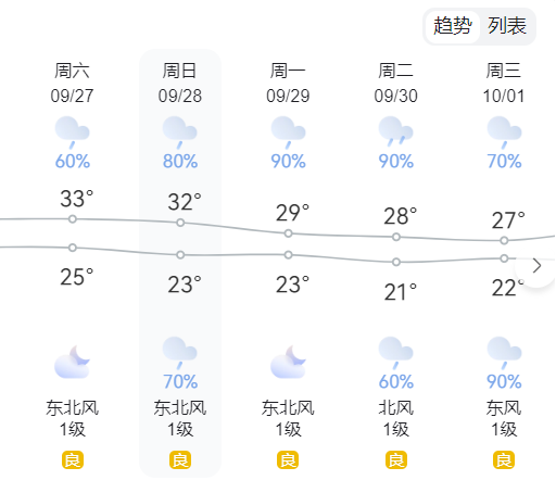 根据中央气象台数据显示,节前9月28日、29日、30日杭州将以阴雨天气为主,最高温度基本在30℃左。