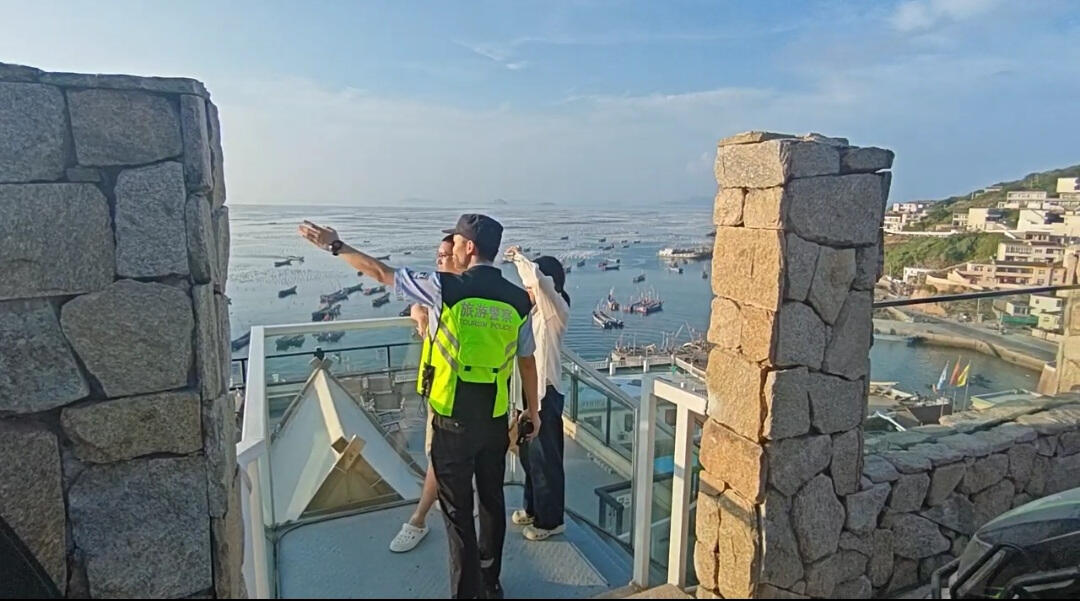 为了守住这份热闹里的安全,枸杞派出所早早就把国庆中秋假期安保方案做细做实:码头增设执勤岗、景区加派巡逻警力、险滩礁石旁立起警示牌,而朱超峰正是核心区的“移动岗哨”。从9月30日起,他的生物钟就跟着游客转:清晨,赶在第一班客轮靠岸前守在码头疏导人流;正午顶着烈日在观景台提醒游客防滑;傍晚沿着渔用码头挨个给商户、游客讲“刷单诈骗”的套路。“每天微信步数最少2万步。”他笑着说。