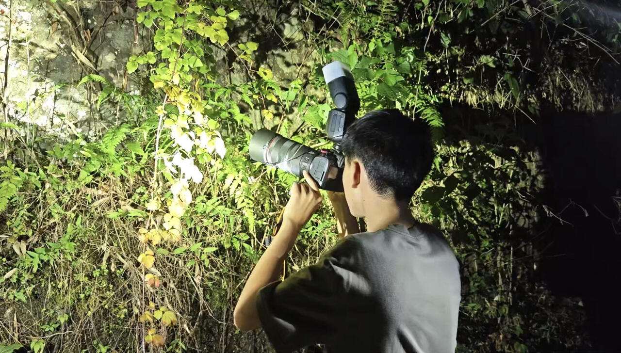 他的脚步渐渐遍布四明山的密林、东钱湖的岸边、荪湖的草丛,尤其到了夜晚,他总会头戴照明灯,握着相机蹲在草丛里,一帧一帧细心记录昆虫的夜间活动。