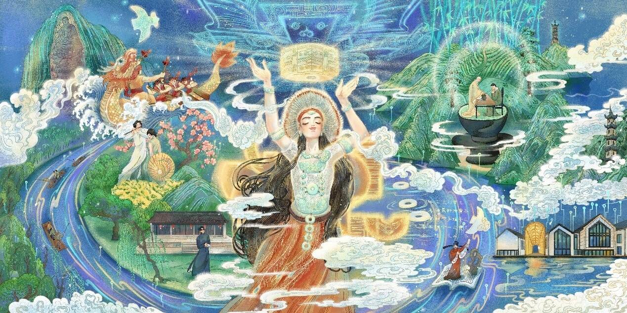 深厚的文化底蕴,是良渚新城最为独特的竞争力。插画家叶露盈的选择就是一个典型。2018年,她将露盈文化落户良渚,不仅是看中这里的政策与空间,更因这片土地五千年文明的深深吸引。从《洛神赋》到《梦回良渚》,她笔下的神女、玉器与星空,完成了一场跨越时空的美学对话,展现出传统与现代的完美融合。