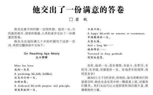“我的一生可以算做一个圆,从一个地方开始,走了很远的地方,现在又回来了。”如今,杨振宁人生已圆,透过他不同时期说过的五句话,笔者试着探寻杨振宁的人生之道。