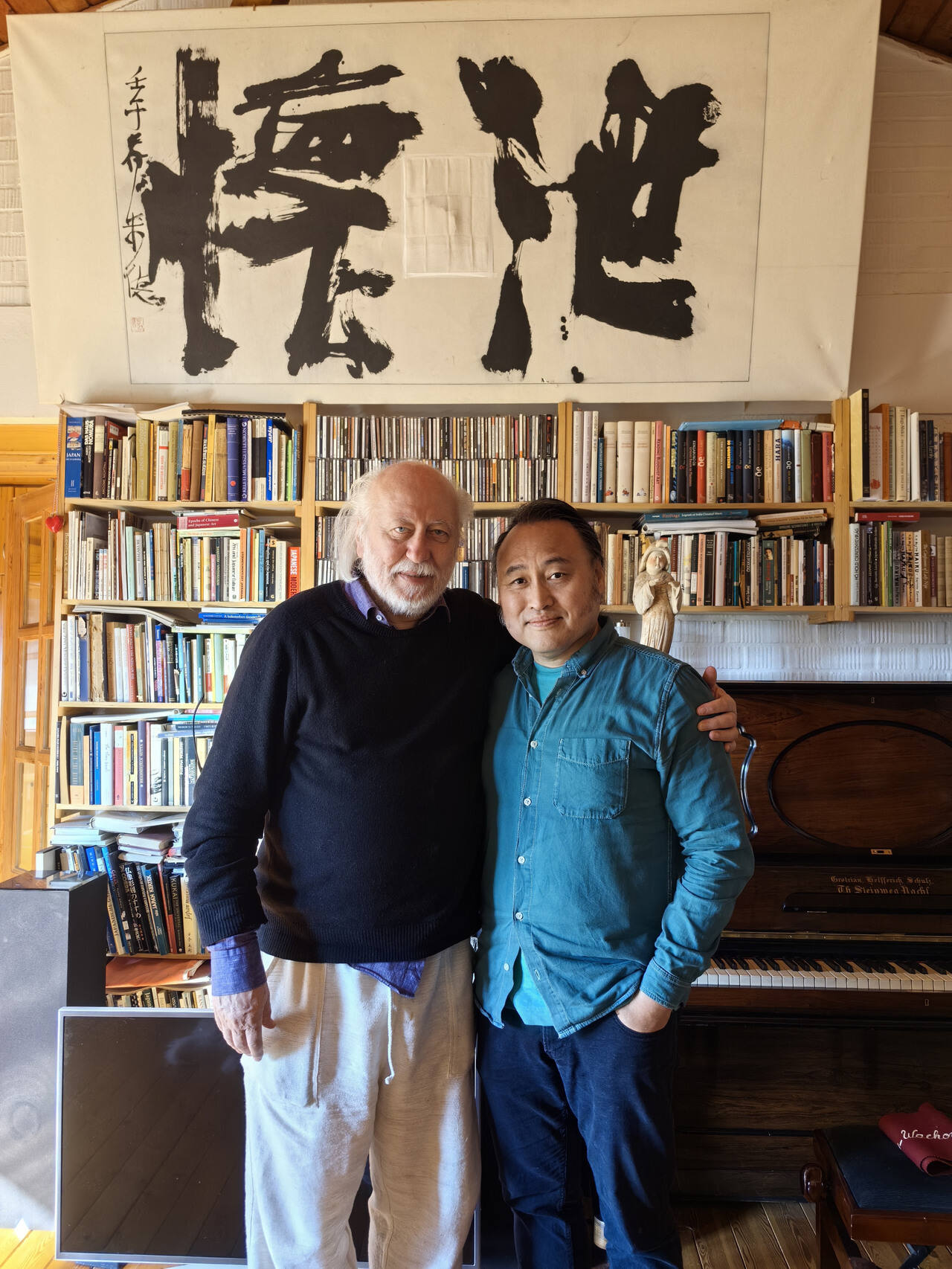 余泽民与拉斯洛在匈牙利拉斯洛家中的合影,上方“泄怀”二字由中国书法家曾来德书写赠送。受访者供图