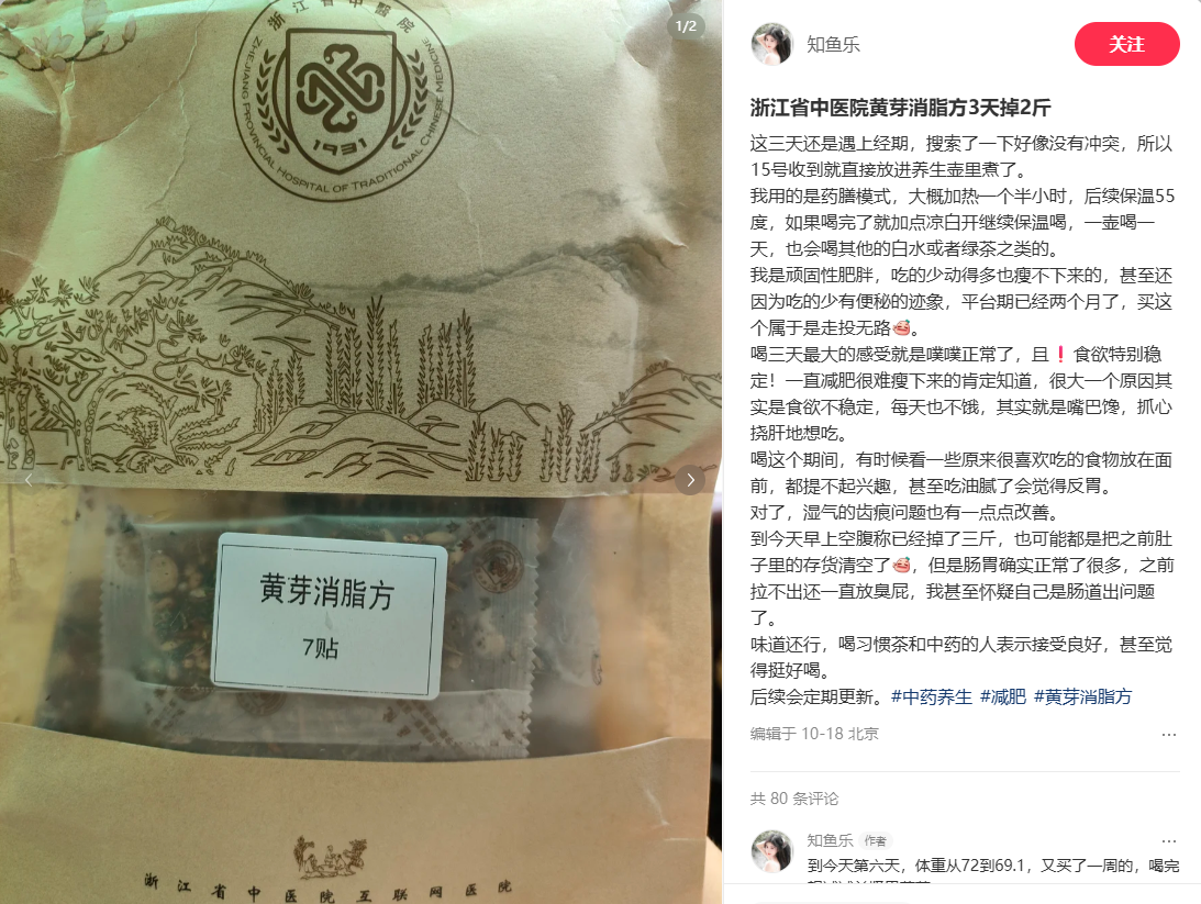 “有股麦芽的香气,回甘发甜,完全不同于传统中药的苦涩。”已经买过几十帖黄芽消脂方的余女士这样形容它的口感,“我没有刻意控制饮食,正常吃饭,一个月从112斤掉到109斤。”