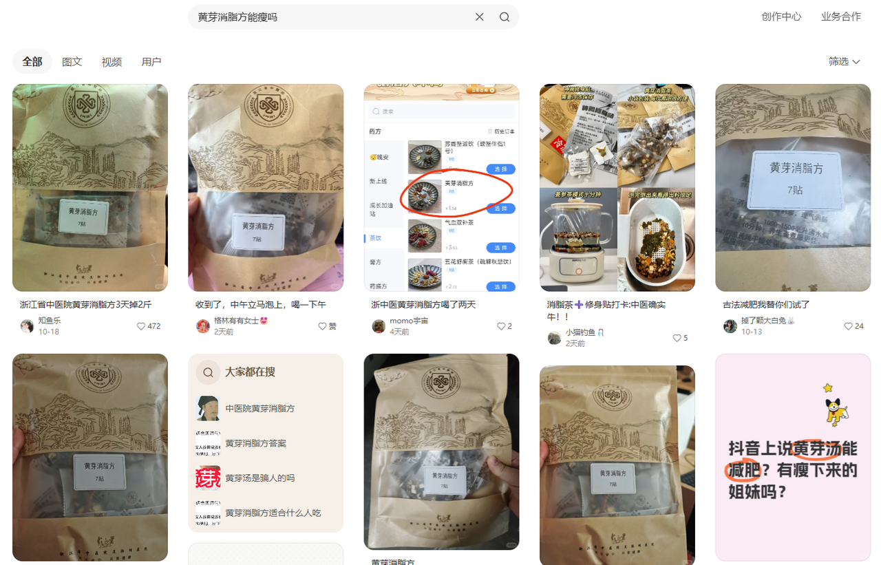 社交媒体平台上关于黄芽消脂方效果的讨论。图 / 小红书