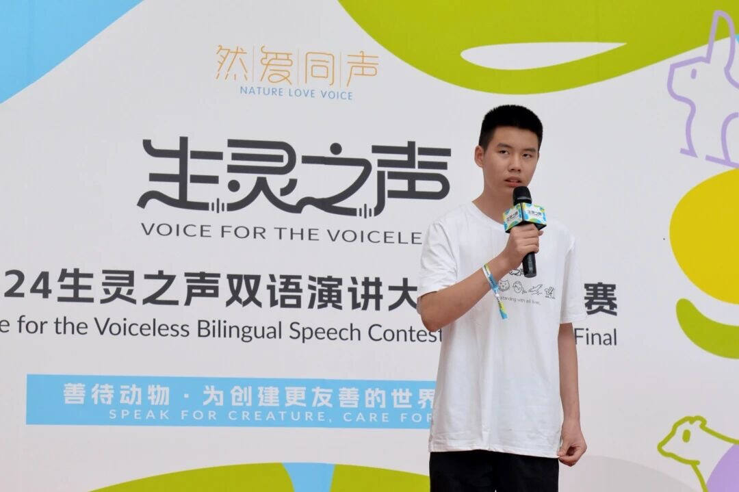首届生灵之声双语演讲大赛中,来自聋哑学校的13岁学生陈天瑞,特意从广西赶来,讲述了他在河边救助一条被困小鱼的经历。邵然为他颁发了特别奖。受访者供图