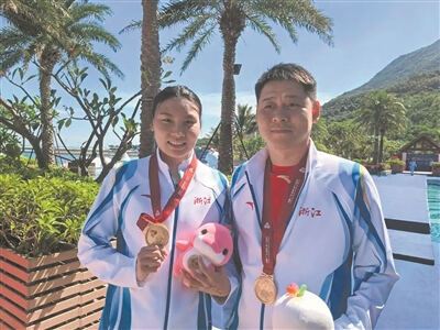 柳雅欣夺冠后与教练郑坤良合影。浙江体育职业技术学院供图