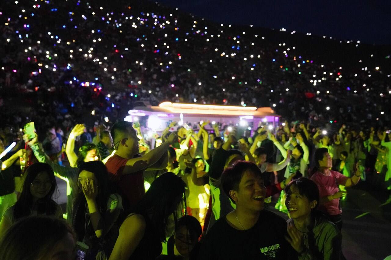 游客在敦煌鸣沙山月牙泉景区参加万人星空演唱会。新华社记者 马宁 摄