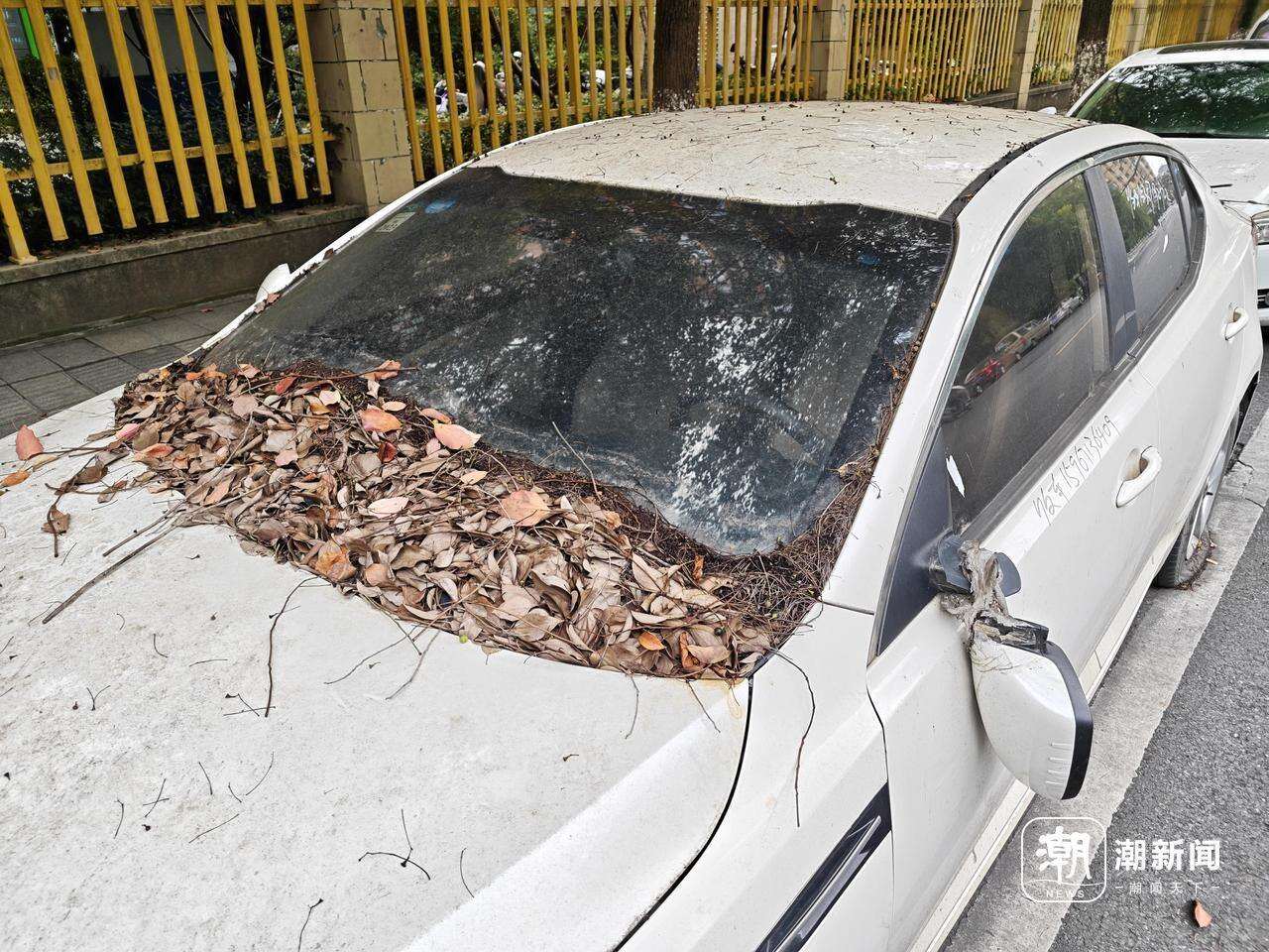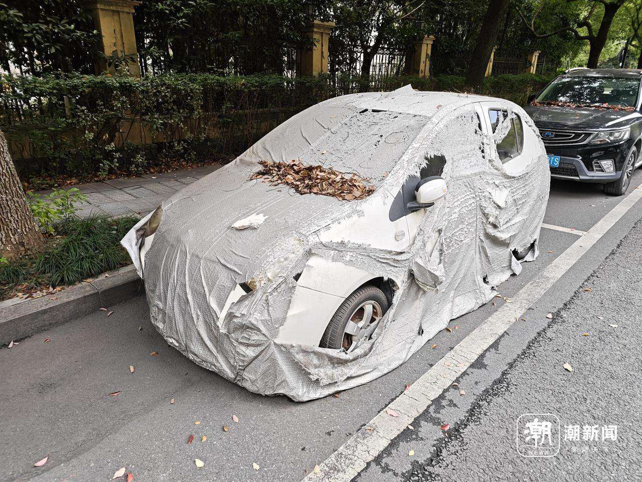 可以很明显地看到,不少车子上都积攒了较厚的落叶。部分车辆的车衣,都出现了明显破损。
