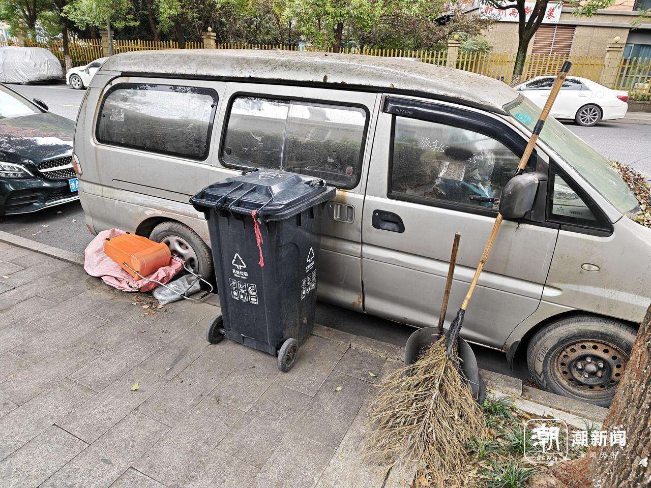靠近人行道一侧,则被放置了垃圾桶、扫把等清洁工具。车身上,水渍和锈斑明显,还被人涂抹上了“报废回收”以及“收购二手车”的广告。