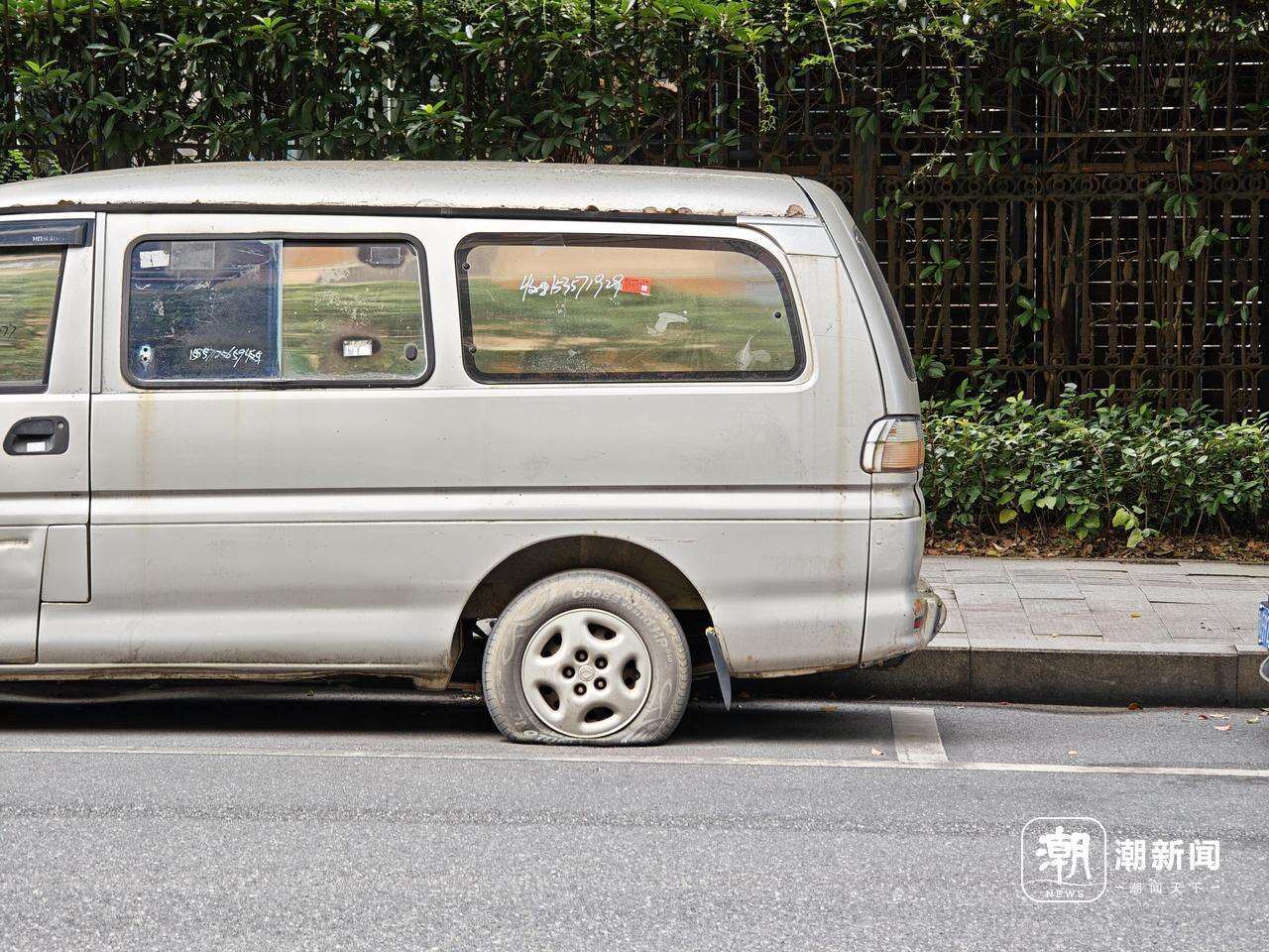 比如靠近墩祥街一侧,有一辆东风牌面包车,前挡落叶较多,四个轮胎都瘪了,车内也堆放着各种杂物。