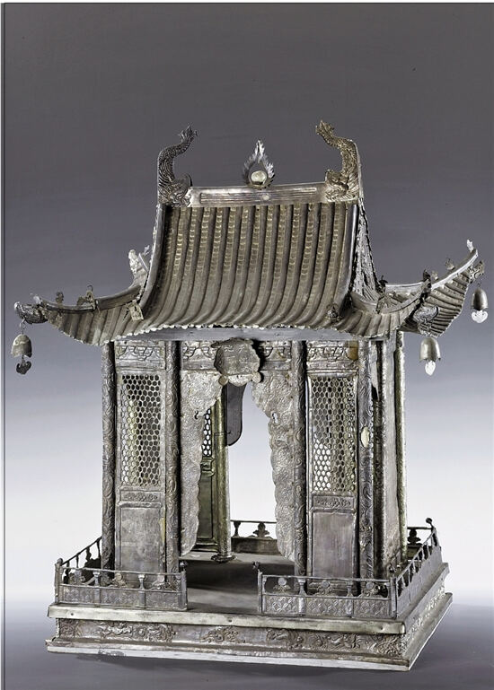 顺着他手指的方向,我们看到面阔三间、进深两间的单檐歇山顶银制建筑模型,顶部与主体各自沉睡在特制的木箱中。