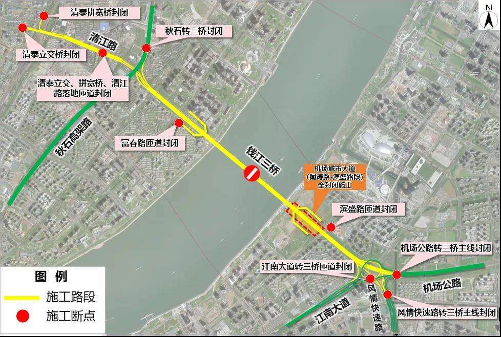 钱江三桥和清江路断流后,将产生9处断点,包括西兴互通由机场公路、江南大道、风情快速路转入钱江三桥的3个匝道,清江互通由秋石高架、清江路转入钱江三桥的2个匝道,钱江三桥滨盛路、富春路2组上下匝道,以及清泰立交桥和清泰拼宽桥两端。9处断点位置分布及具体封闭情况如下: