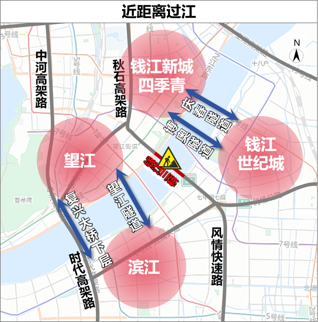 1.近距离过江出行。钱江新城、四季青、望江等区域往返滨江、钱江世纪城的可通过复兴大桥下层、望江隧道、庆春隧道、博奥隧道通行。