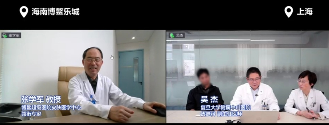 该患者11月份通过微医“AI+皮肤病全疾病周期管理平台”,到上海微医线下医院就诊,医院为其邀请了复旦大学附属中山医院皮肤科副主任医师吴杰问诊,通过乐城医联体平台,远程连线海南超级医院的专家会诊,两地医生共同评估病情,一致认为可以采用芦可替尼乳膏进行治疗。