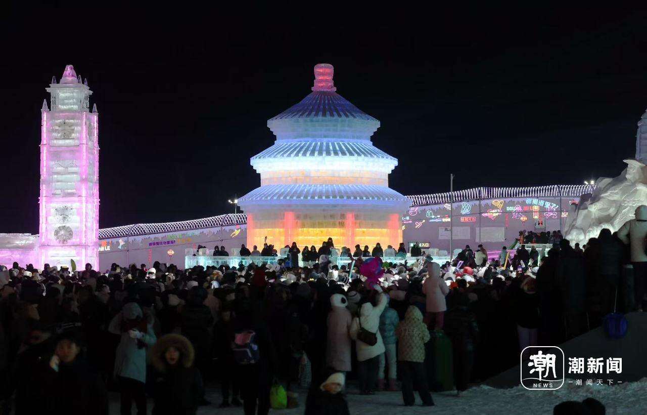 12月27日,长春冰雪新天地大舞台前人山人海,当天入园人数破万,其中有不少来自浙江等地的南方游客。记者 王建龙 摄
