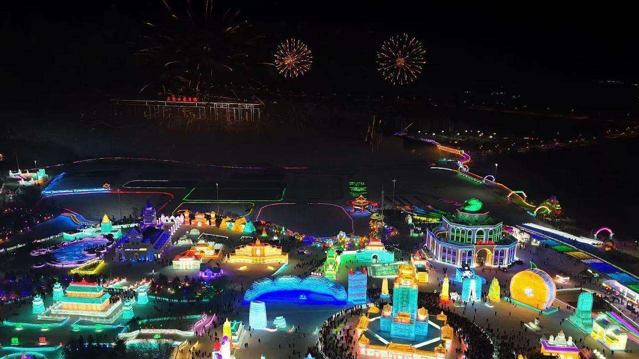 12月27日,空中俯瞰长春冰雪新天地,美轮美奂。当天入园人数破万,其中有不少来自浙江等地的南方游客。记者 王建龙 摄