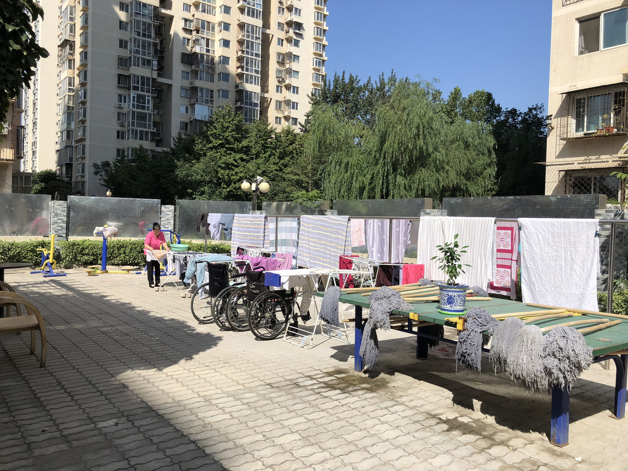 在一些机构,室外活动空间沦为晒被子的场所。受访者供图