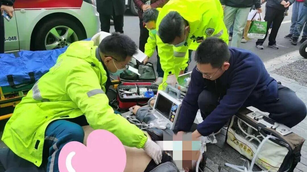 1月9日中午,在宁波市海曙区鼓楼鼎新街街巷交叉口,一名男子突然倒地不起。现场群众发现后大声呼救,恰巧经过的鼓楼街道派出所民警张添添,见状立即下车上前查看。