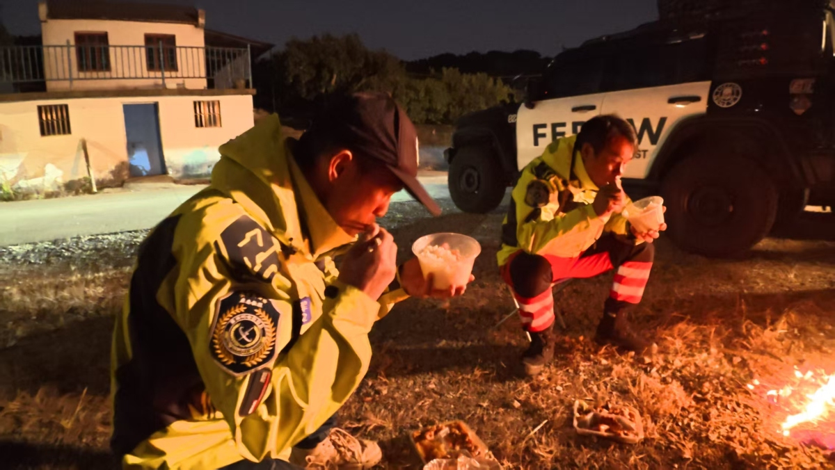 队员们在救援间隙吃饭。