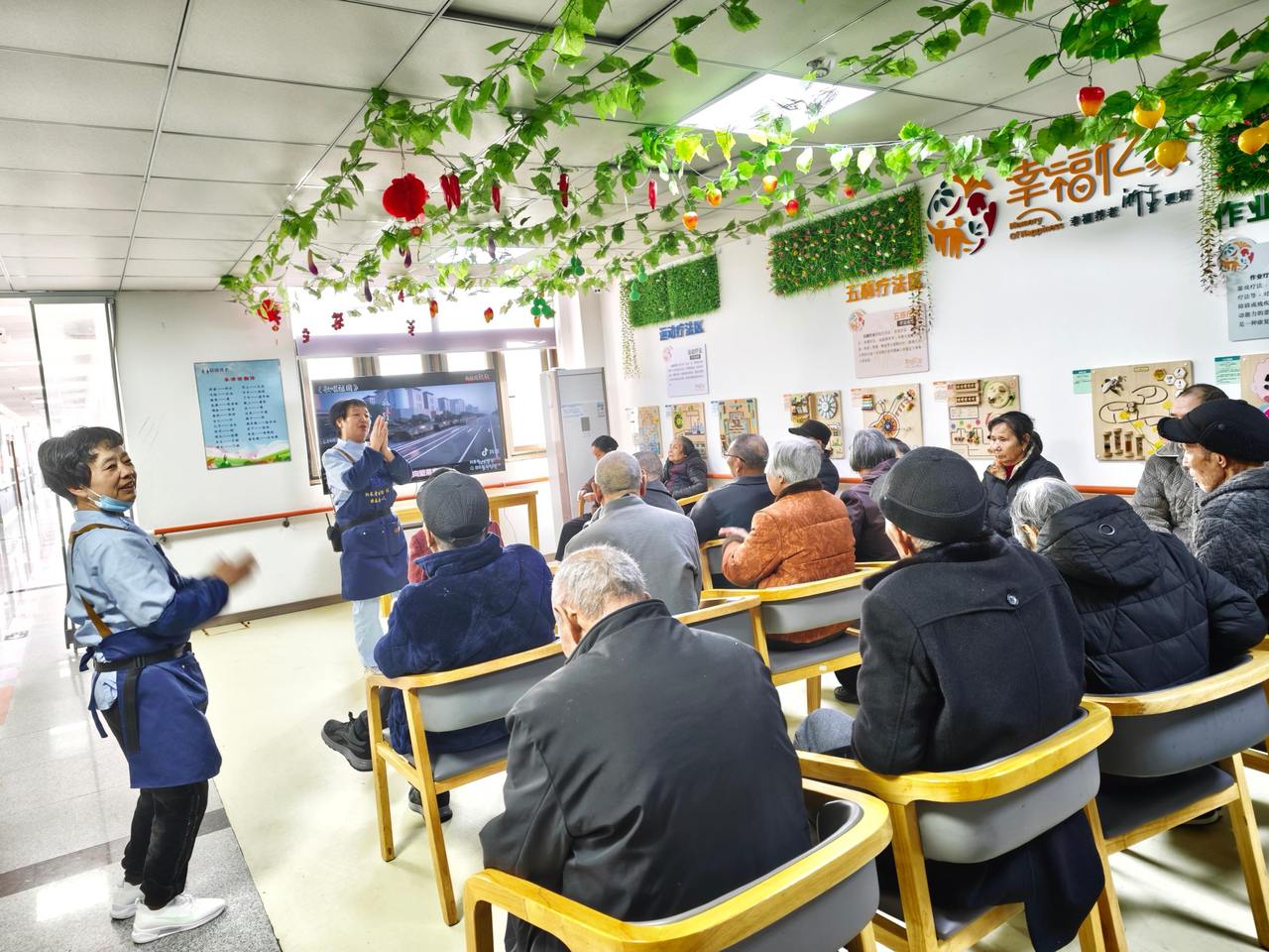 走进颐养中心,仿佛踏入一个充满温情与关爱的世界。每一处细节,都展现着对失智老人细致入微的守护。一楼是宽敞明亮的公共活动区。 进门醒目处张贴着一周营养菜单和精彩活动预告。每位老人都有专属座位,餐桌上精心制作的饮食名片清晰标注着照片、姓名、饮食喜好与忌口禁忌。用餐前,老人们会在护理员带领下齐声诵读“a、o、e”——这一简单口腔操是龚昌文远赴日本向专家取经的妙招,能有效锻炼吞咽功能,减少呛咳风险,守护每一餐的安全与愉悦。食堂后方的小舞台,则是老人们欢乐的天地。平日里经典小品电视轮番上映,每逢佳节精彩活动热闹展开;每到月末,中心为当月生日老人精心筹备集体生日会。