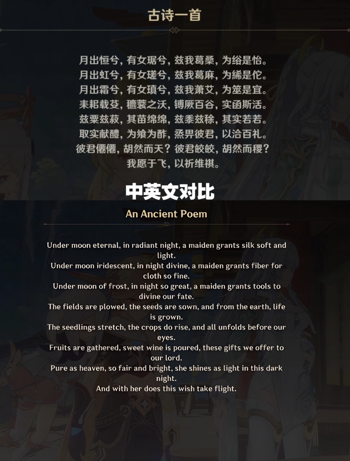 在米哈游旗下游戏《原神》中以中国文化为原型构建的璃月地区,每年农历新年前夕都会举办融合春节团圆寓意与元宵节赏灯传统的“海灯节”。今年“海灯节”,游戏里上线了一首仿《诗经》格式写的诗——《琅风·兹白》。“月出恒兮,有女琚兮”,玩家们一边看一边给生僻字注音,在游戏里学起了语文。很快有人问:这个要怎么翻?游戏翻译团队给出了答案:英文版用简洁工整的句式还原了诗的节奏,某些段落还借了古英语的韵律。