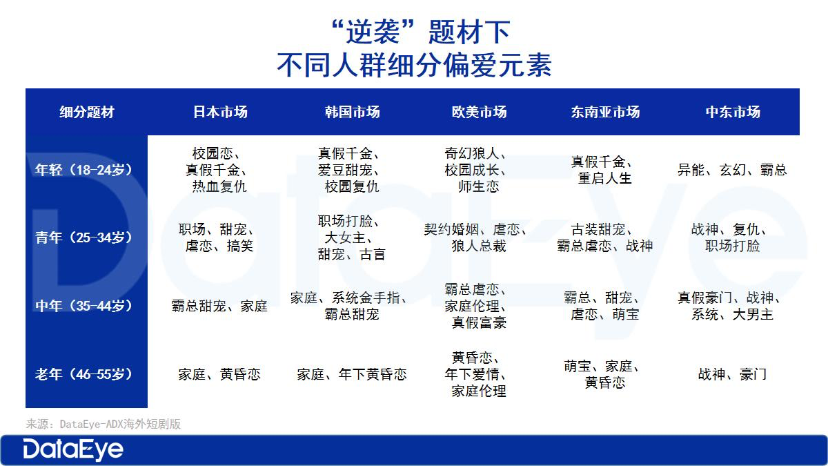 DataEye统计的“逆袭”题材的微短剧中,不同人群细分偏爱元素。图源:DataEye-ADX海外短剧版