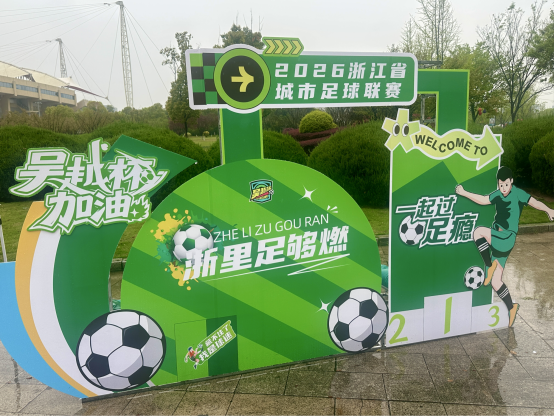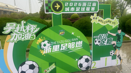 这一次,观众入口处设置了多个主题打卡点,背景板以“浙里够燃”为主视觉,融入吴越杯元素和足球图案。打卡点还设置了仿真的绿茵草坪背景和球员剪影造型,许多球迷被吸引而来,摆出射门、庆祝等动作进行打卡合影。