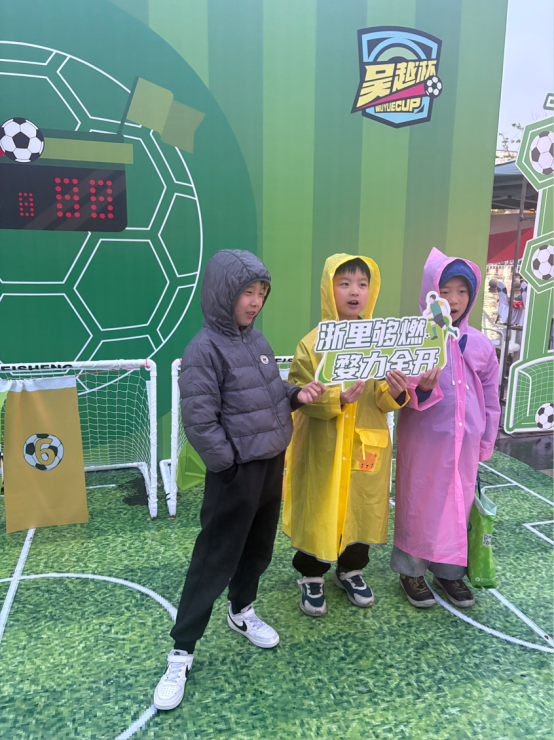 同时,一旁还设置了互动射门挑战区。场地边摆放着简易的射门装置,球门不大,距离不远,规则也简单——只要在规定距离内完成射门。现场,不少带着孩子来看球的家长在此排队体验。从金华来的雷广发就带着8岁的儿子排在队伍中间,他说:“听说4月6日吴越杯就要开赛了,今天先带孩子在这里热热身。”