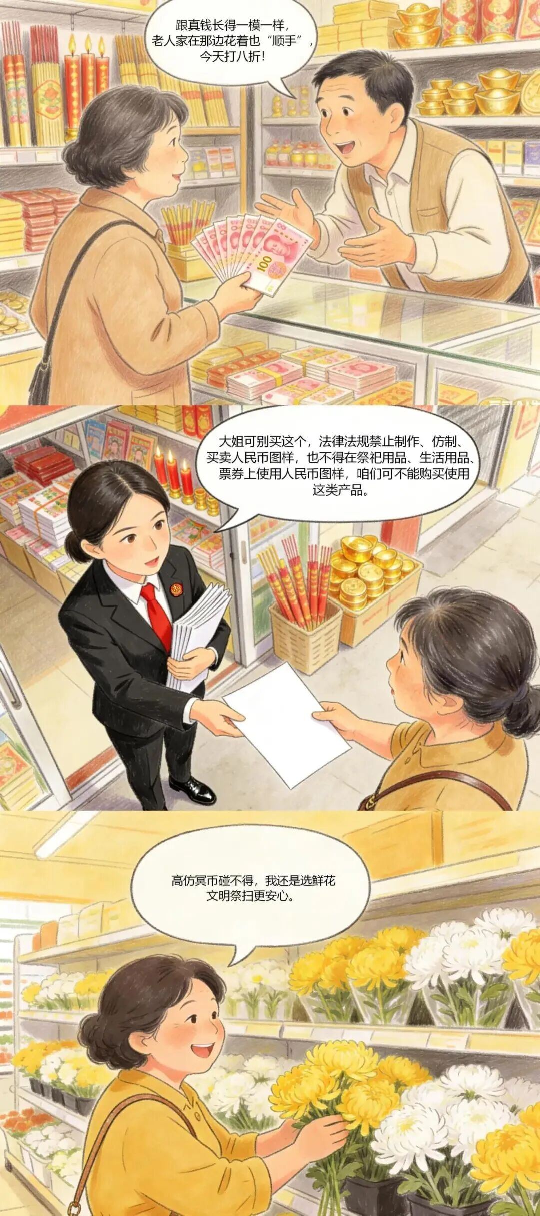 《中华人民共和国人民币管理条例》《人民币图样使用管理办法》等明确规定,禁止制作、仿制、买卖人民币图样,不得在祭祀用品、生活用品、票券上使用人民币图样。清明选购祭祀用品请认准正规商家的合规产品,不要购买印有人民币图样、封建迷信图案的违规祭祀用品,文明祭扫从选对祭祀用品开始。