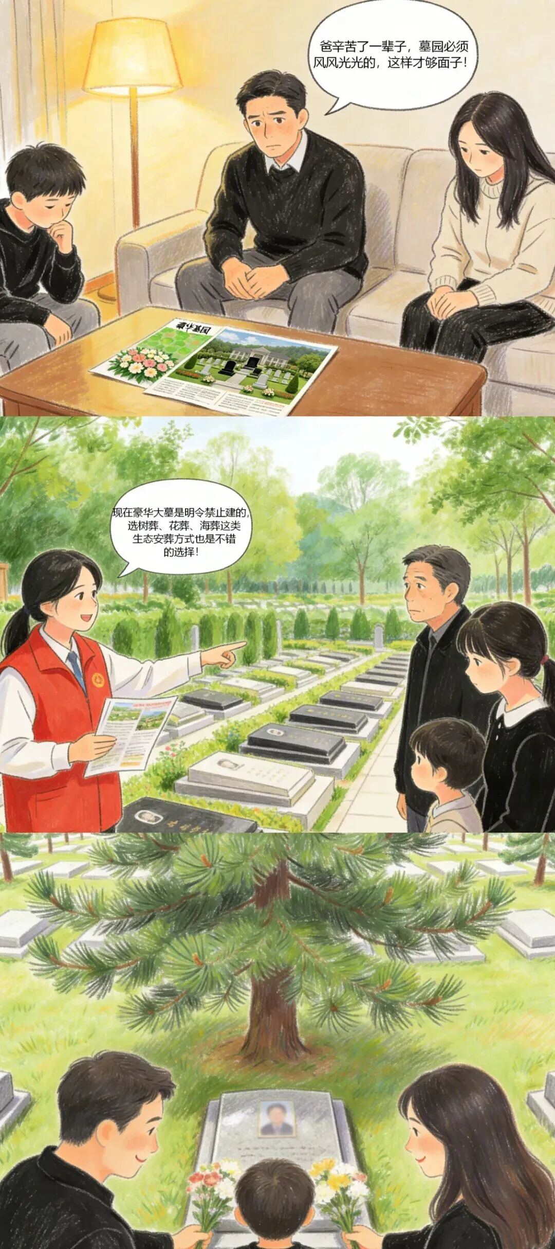 根据《殡葬管理条例》相关规定,我国推行不占地或者少占地的安葬方式。在实行火葬的地区,鼓励和引导骨灰海葬、树葬、花葬、草坪葬等安葬方式。公墓应当以节地生态安葬为导向,推行墓位和墓碑小型化,并划定一定区域实施生态安葬和骨灰格位安葬。告别不必要的铺张,归于自然是最好的纪念。