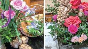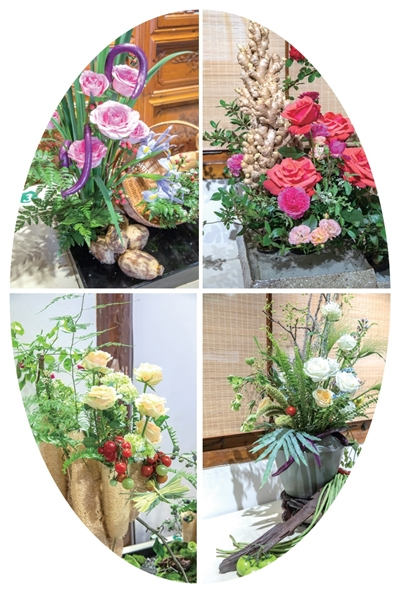 此外,郭庄内还设置“花艺生活”主题插花展区。记者在现场看到,混搭水果蔬菜的月季插花作品妙趣横生,大家纷纷驻足观赏拍照。用一整棵生姜搭成“姜山”的《江山如此多娇》,加入茄子、莲藕、辣椒等蔬菜的《蔬野花繁》,一把长豇豆横卧其间的《春意未央》,连老熟后的丝瓜络也被拿来搭配插花,混搭风尽显,生活气满满。