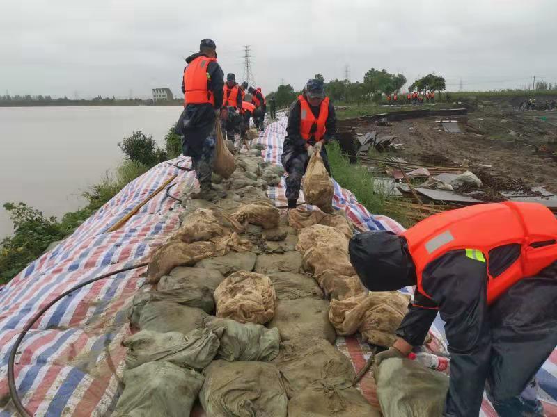 在关键时刻,江北洪塘街道迅速集结了一支由班子领导带队、街道青年党员干部、街道民兵和92852驻地官兵以及下梁闸工地工人组成的应急救援队,120余人一字排开,将红色党旗插在了下梁闸工地上。仅过了3个小时,一条300米长的“生命线”牢牢筑在姚江北岸。