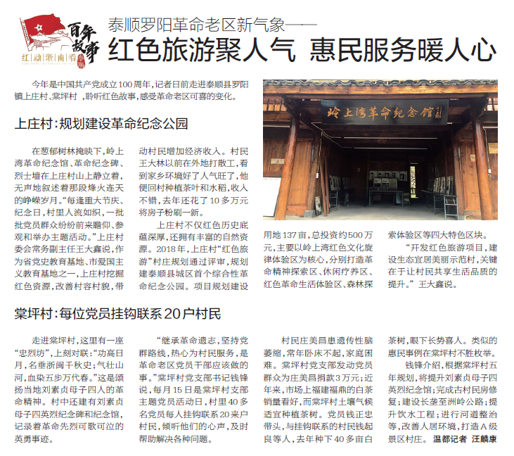 今年是中国共产党成立100周年,记者日前走进泰顺县罗阳镇上庄村、棠坪村 ,聆听红色故事,感受革命老区可喜的变化。