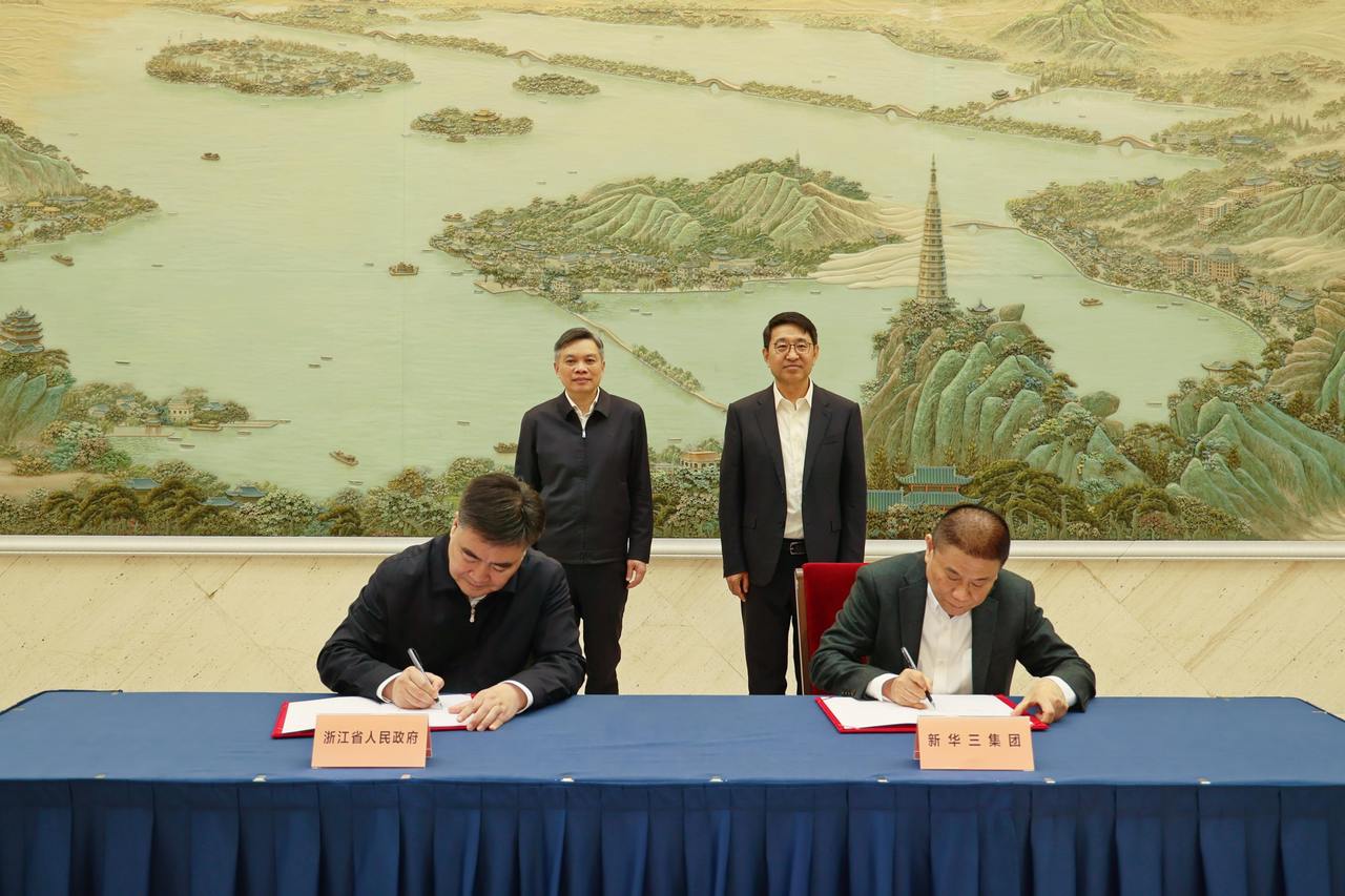 浙江省副省长何中伟和新华三高级副总裁王小鲁代表双方签署协议书。