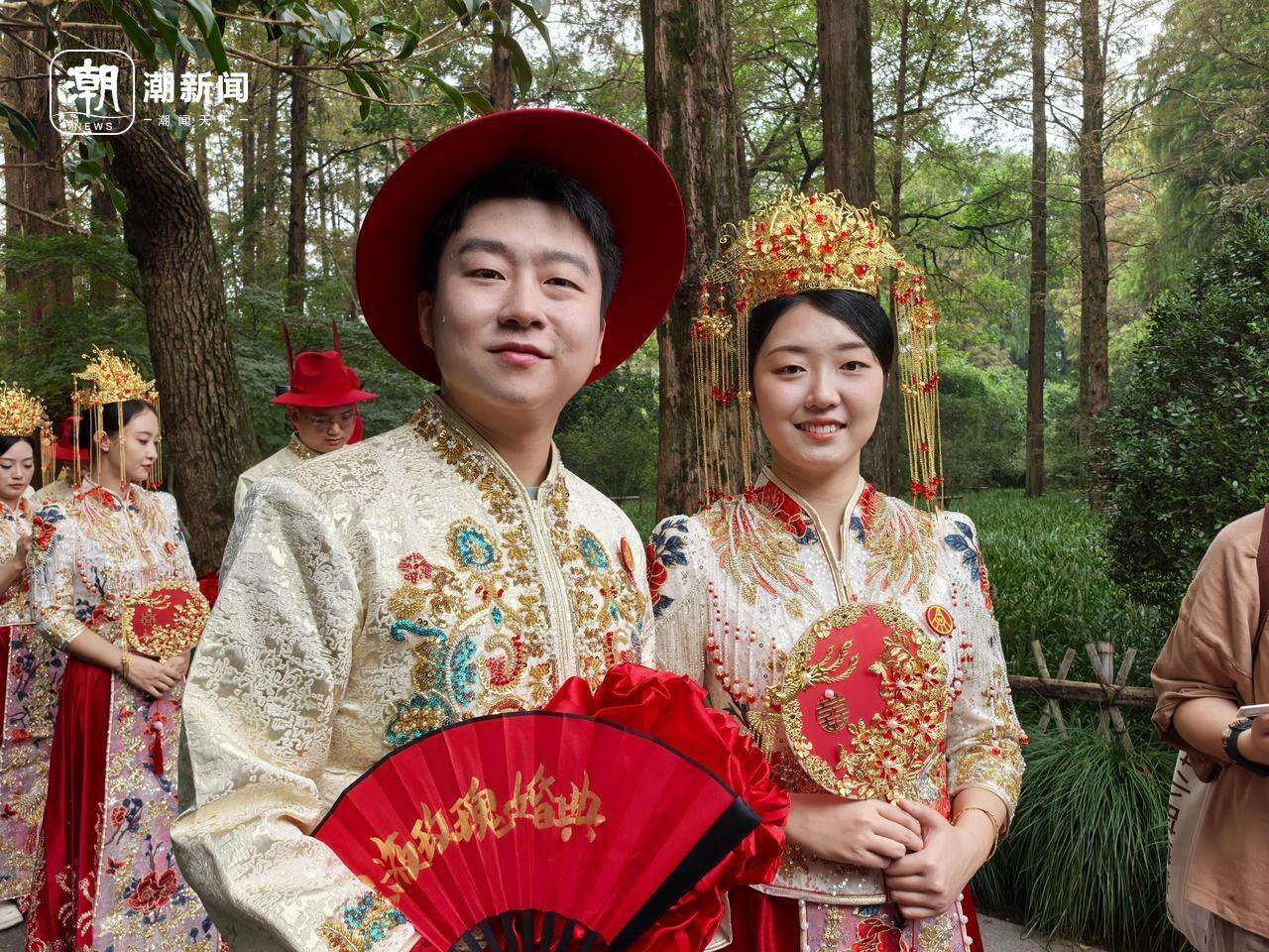 “我们是杭州本地人,爸妈是第一届玫瑰婚典的新人,所以我们也来啦!”24岁的新人马潇翔和王胜蓝是高中同学,相恋多年的他们前几天刚办完西式草坪婚礼,又特地来体验传统中式婚典的浪漫。