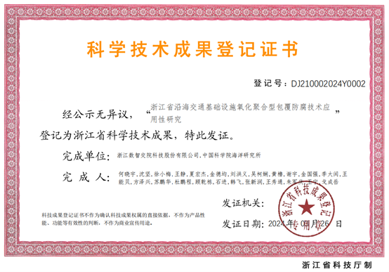 数智交院院士工作站聚焦海洋腐蚀防护技术研发与工程应用。2020年,在侯保荣院士团队指导下,公司牵头开展省交通厅科技计划项目《浙江省沿海交通基础设施氧化聚合型包覆防腐技术研究》(2020003),并入选交通运输部《2020年度交通运输行业重点科技项目清单》。该项目针对海洋大气区异型钢构件的防腐难题,系统开展了氧化聚合型包覆防腐技术的应用性研究。