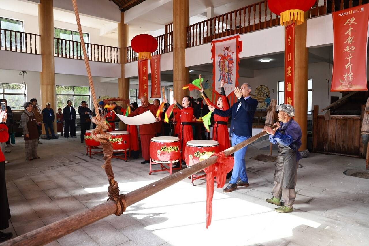 开榨现场,常山喝彩歌谣国家级非物质文化遗产代表性传承人曾令兵高亢喝彩,舞龙舞狮欢腾跃动,唢呐声悠扬回荡,依次展示油茶树“春萌芽祈福”“夏繁枝喝彩”“秋硕果庆丰”“冬开榨纳福”四个主题。在传统榨油坊内,烘焙茶籽的浓郁香气扑鼻而来,曾令兵以古老仪式祈愿丰收。榨油师傅推动木榨,金黄色的山茶油缓缓流出。