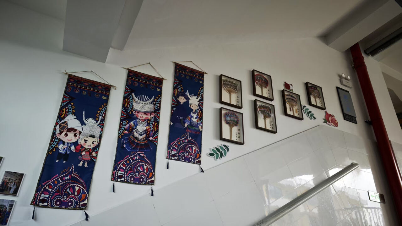 漫步校园,民族文化气息扑面而来。教室走廊的民族文化展区清晰呈现各民族节日习俗;楼梯墙壁悬挂着色彩绚丽的民族扇子——高山族的贝壳羽毛扇、彝族的火红太阳扇、维吾尔族的古丽扇……图书馆外的“石榴花开·籽籽同心”文化长廊,系统展示着56个民族的概况、服饰、建筑与饮食文化。